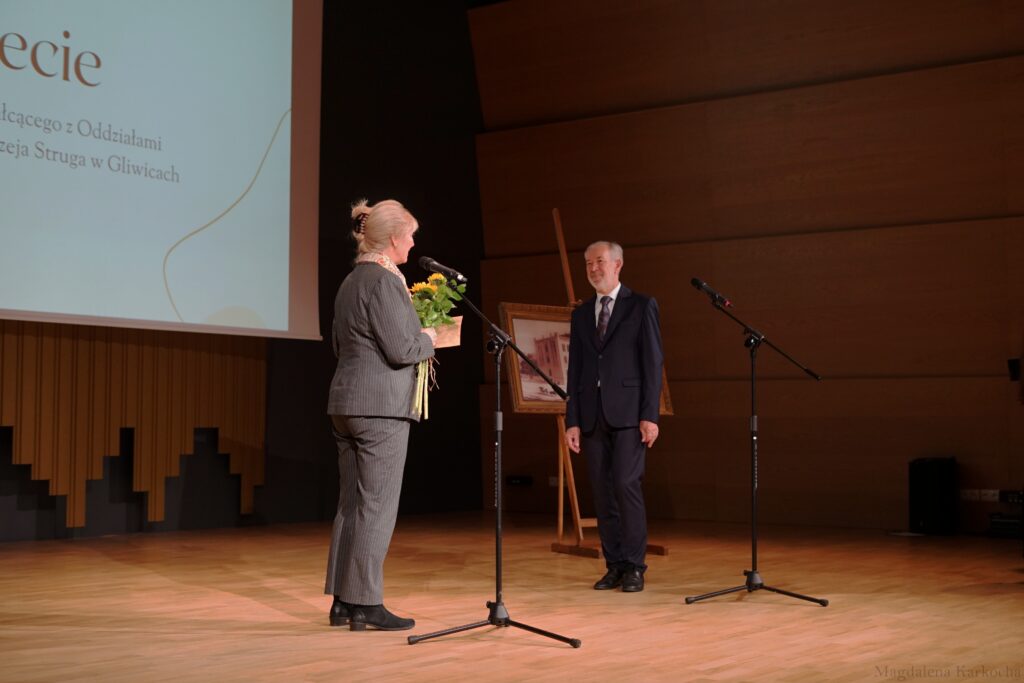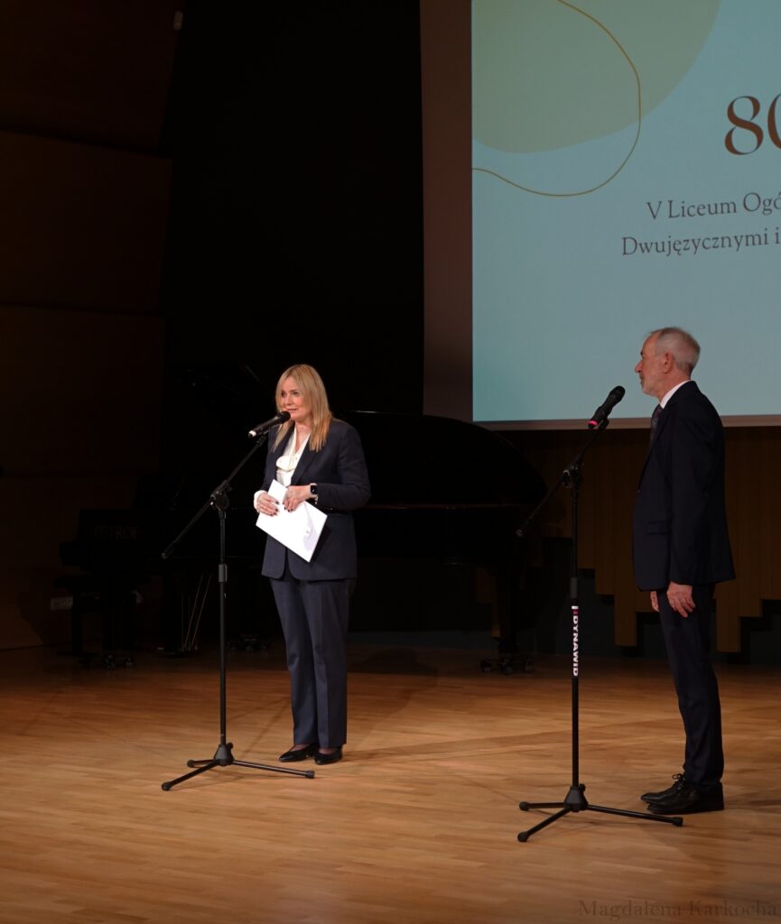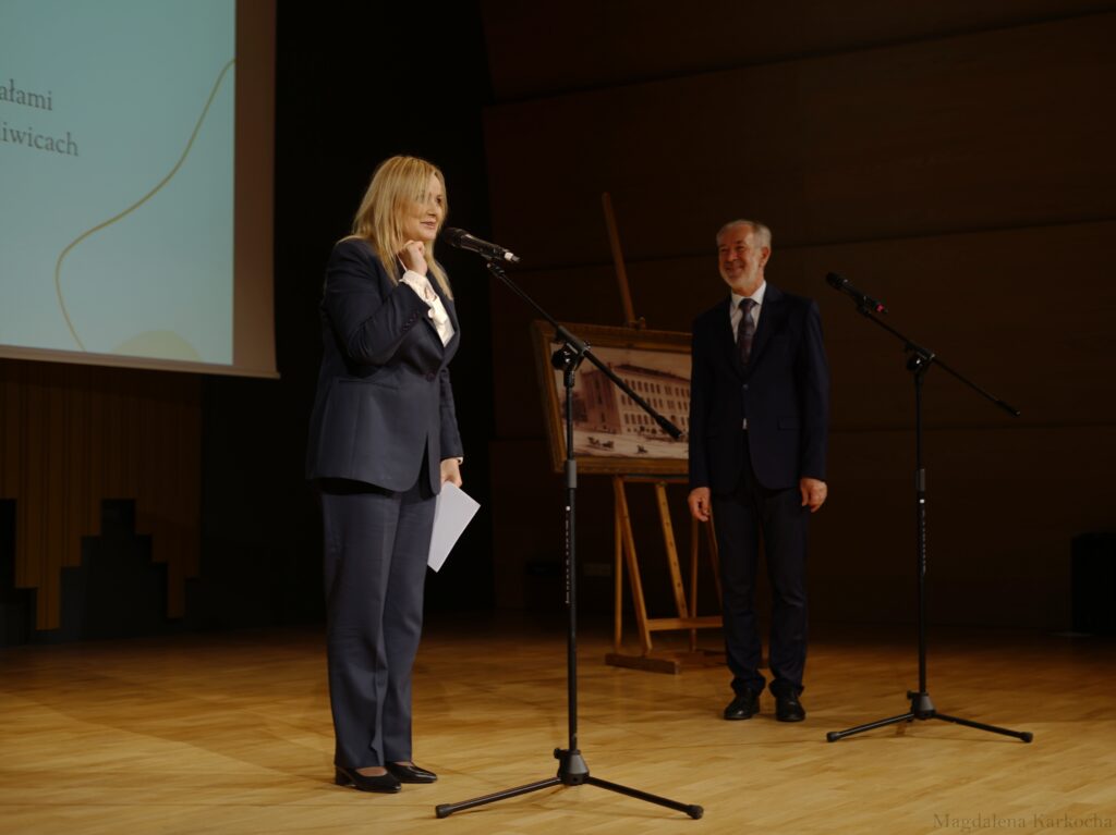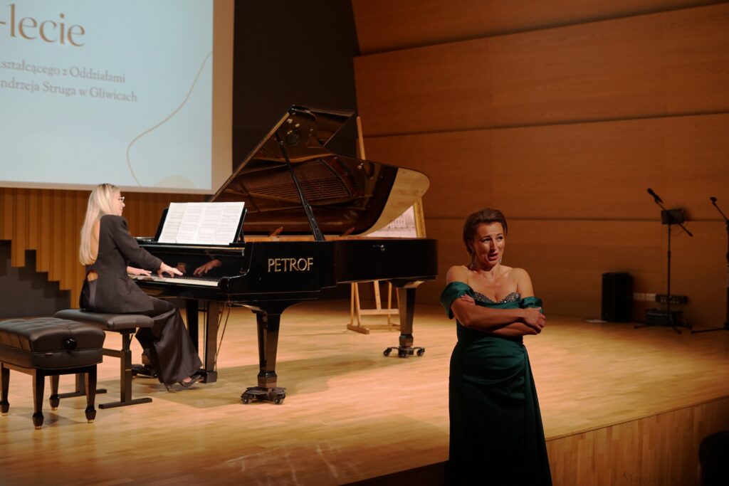 Następnie o godz. 12:00 spotkaliśmy się na gali jubileuszowej w sali koncertowej Państwowej Szkoły Muzycznej im. Ludomira Różyckiego. W uroczystości wzięło udział kilkaset osób: aktualni, byli oraz emerytowani nauczyciele i pracownicy VLO, absolwenci – także sprzed nawet kilkudziesięciu lat – uczniowie, rodzice, Dyrekcja oraz zaproszeni goście na czele z panią Prezydent Miasta Gliwice Katarzyną Kuczyńską – Budką (również absolwentką naszej szkoły).