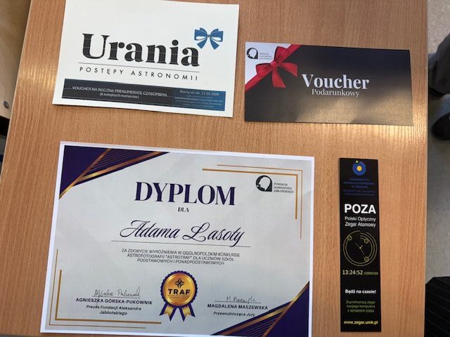 Z radością informujemy, że Adam Lasota z kl. 3a został wyróżniony w ogólnopolskim konkursie astrofotografii „AstroTRAF” za fotografię Drogi Mlecznej. Konkurs odbył się w ramach projektu „Ścisły TRAF – Technologia, Robotyka, Astronomia i Fizyka”, realizowanego przez Fundację Aleksandra Jabłońskiego i finansowanego ze środków Ministra Edukacji Narodowej w ramach programu „Odkrywcy”. Serdecznie gratulujemy i życzymy dalszych sukcesów.