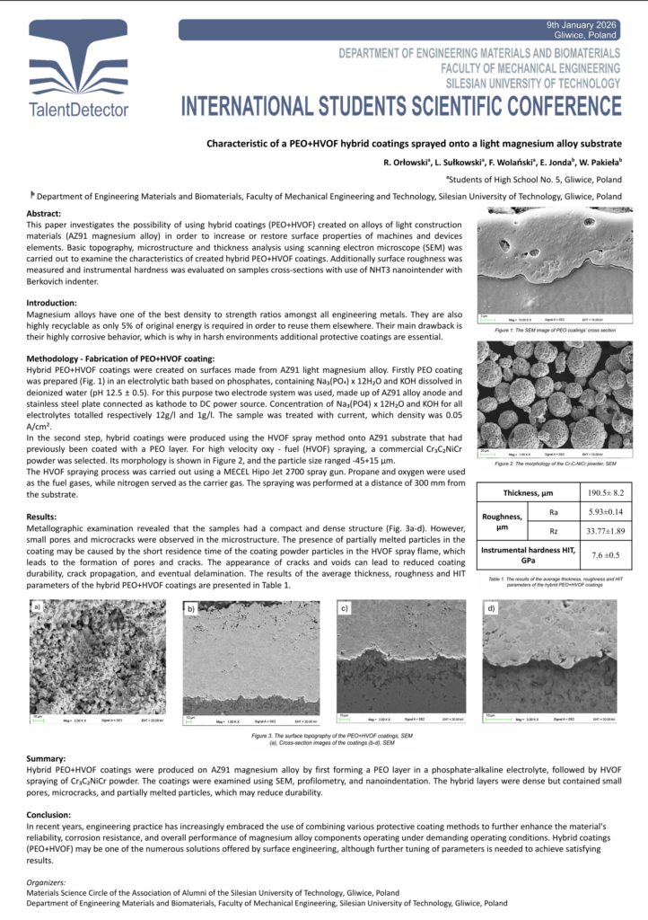 W ramach tego przygotowali artykuł naukowy o hybrydowych powłokach PEO+HVOF na lekkich stopach magnezu.